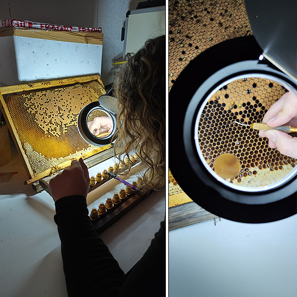Nous produisons des cellules royales à partir de nos lignées rigoureusement sélectionnées pour leurs performances en production de miel et de pollen, leur comportement hygiénique face au varroa, leur résistance aux maladies, leur faible tendance à l’essaimage et leur douceur.